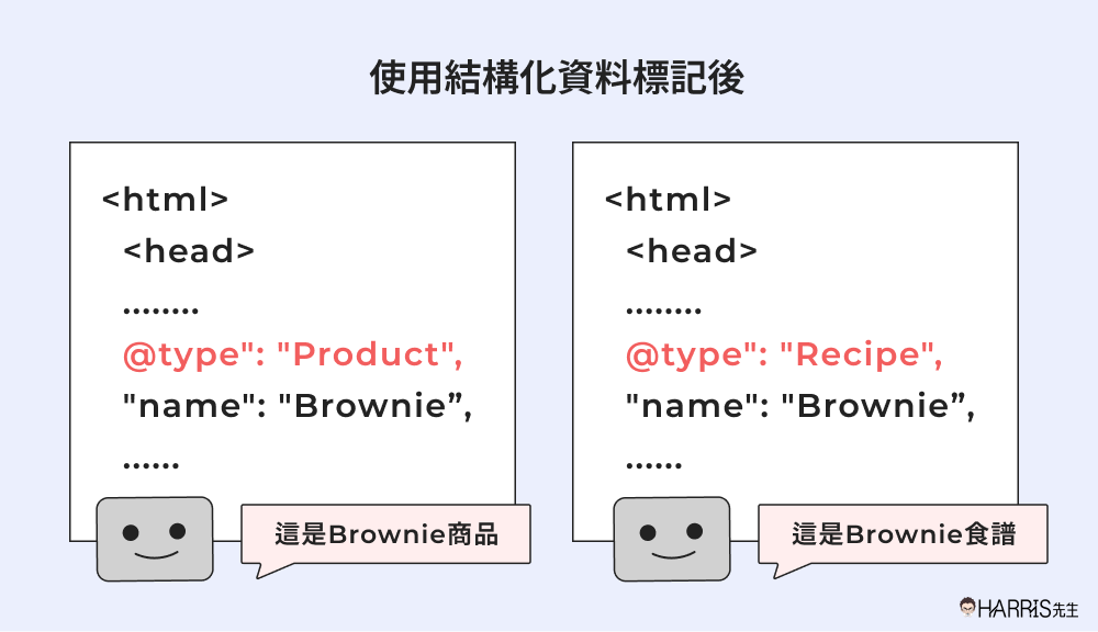 使用結構化資料標記後,即可提醒 Google ,網頁上的 Brownie 究竟是哪一種類型的內容,就能更容易讓網頁內容以相符的模式出現在搜尋結果上。