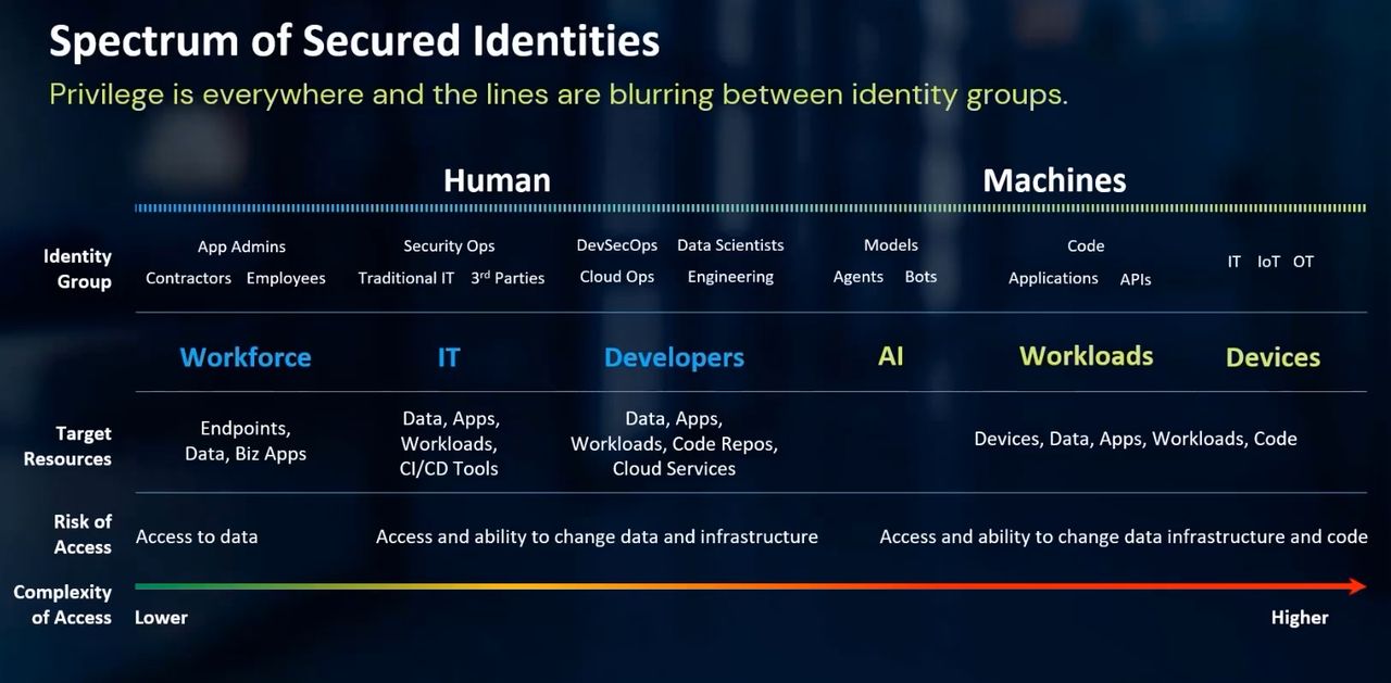 霍超文說,改變最大的就是AI,過去機器的身分是固定的,每個App提供專屬的功能,到了AI領域,功能更多元,可做的事情很多,可以產生其他AI的身分,而且,AI身分也遠遠超越一般的機器身分,因為它不僅可以自行建立、也能自己產生,也可以透過代理人的身分執行工作,因此,造成機器身分數量高速爆發。