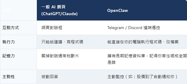 一般的AI是「你問它答」,OpenClaw是「你下指令它去執行」。
